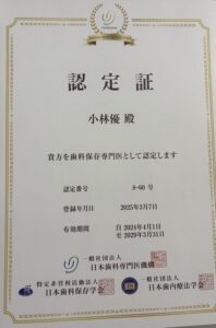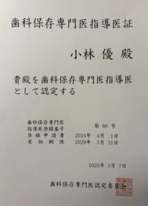 認定医としての最上級の歯科保存専門医指導医の認定も受けました。